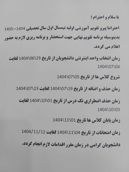 پایان کلاس ها:1404/11/01 امتحانات:1404/11/04 لغایت 1404/11/21